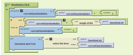 In the President's Quiz App, there was a Next button. When the user clicks that button, an index is incremented and the next question displayed. Here are the blocks: